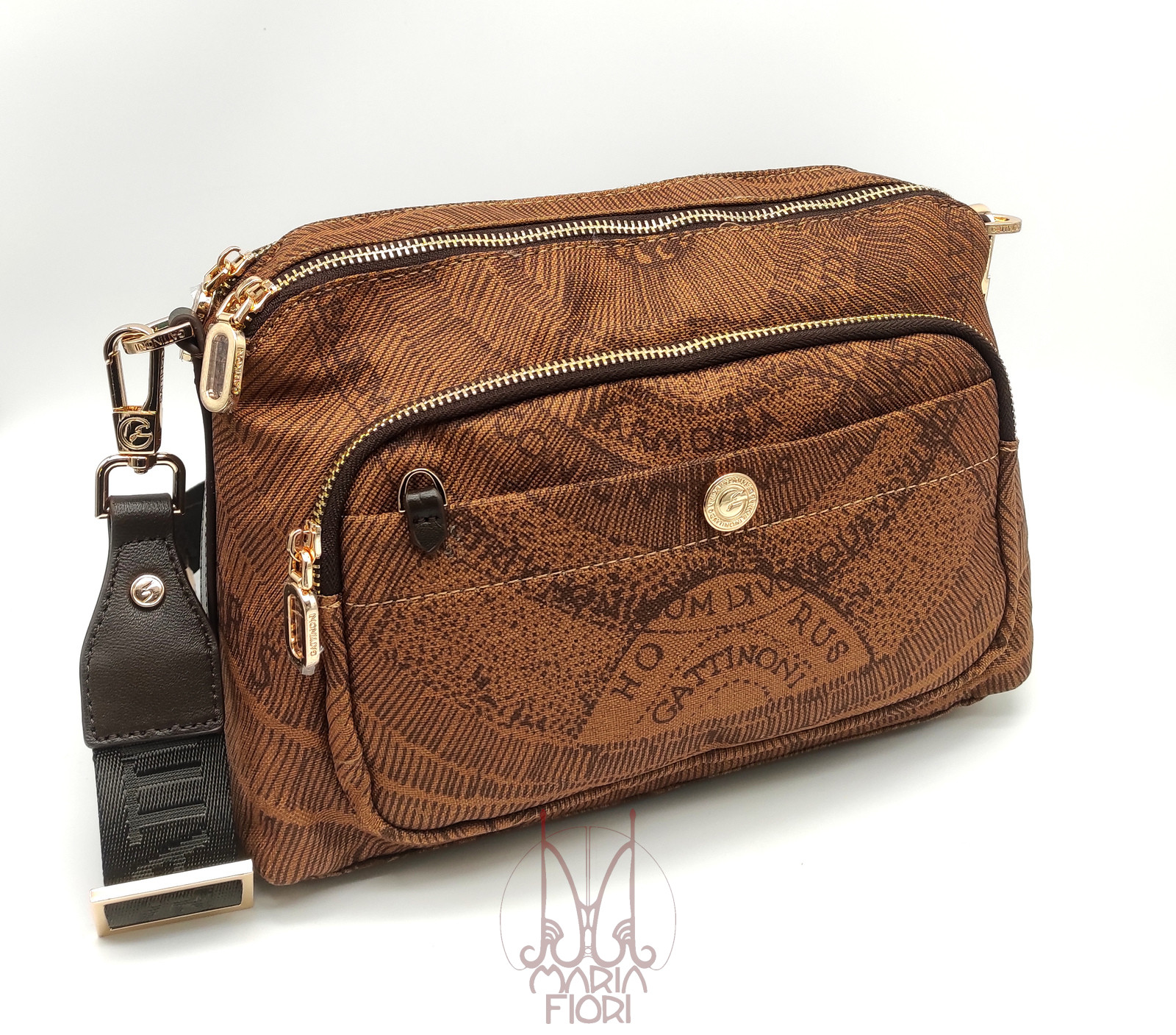 Borsa con tracolla a nastro regolabile, utilizzabile sia crossbody che a spalla multi tasche esterne. Interno foderato con tasche di cortesia e ulteriore tasca zip. Fornito di porta carte zip a tema.