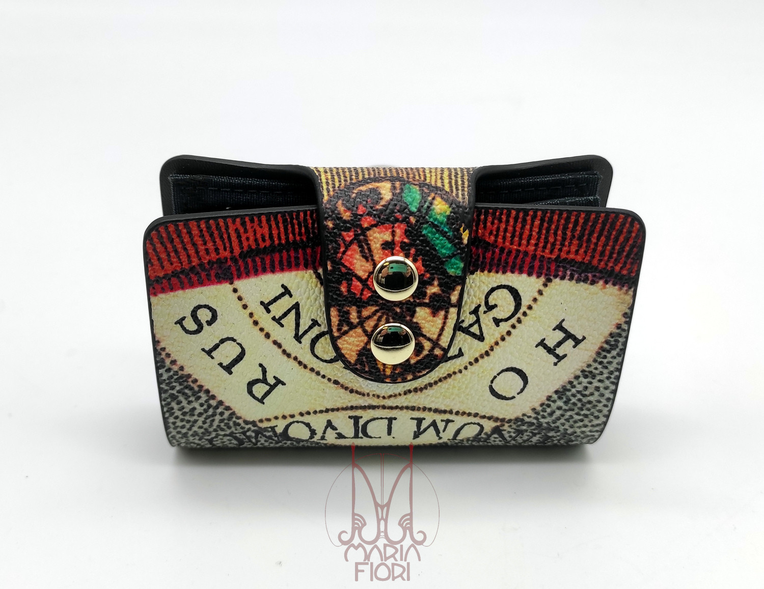 Portafogli stampa Planetarium e dettagli interni in nero con chiusura frontale flap.